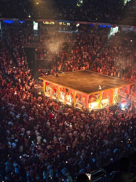 Image Description: A sea of fans surrounds La Casita, the glowing centerpiece of Bad Bunny’s concert at the Coliseo. The stage is designed like a vibrant Caribbean house, with arches, plants, and warm orange lighting spilling into the crowd. Thousands of people press close, phones raised to capture the moment, while smoke and lights create a charged, electric atmosphere. The scene feels less like a concert and more like a massive block party—an intimate house gathering expanded to arena size, with the spirit of the Caribbean pulsing through every corner.